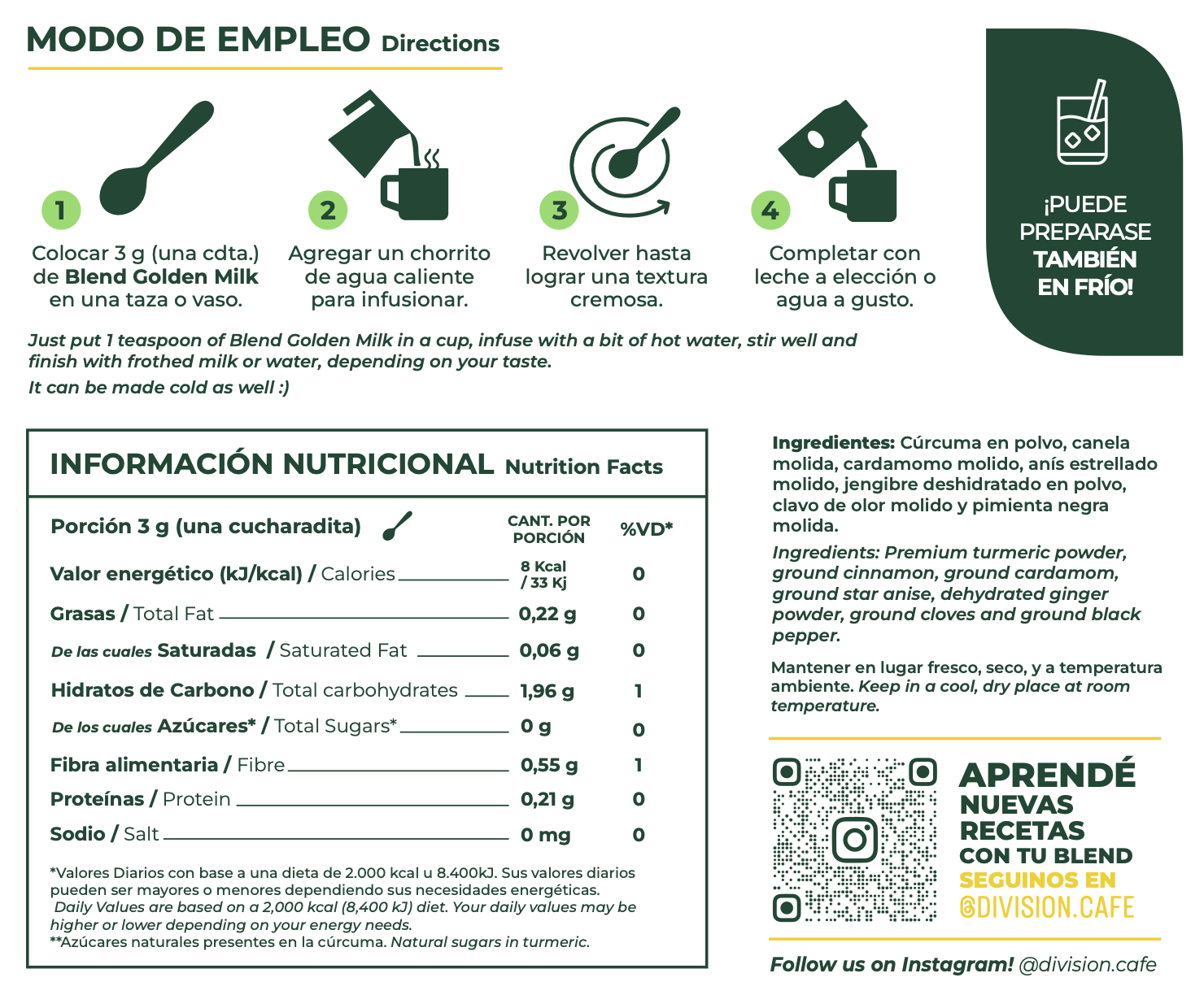 Ingredientes: Cúrcuma en polvo, canela premium molida, cardamomo molido, anís estrellado molido, jengibre deshidratado en polvo, clavo de olor molido y pimienta negra molida.